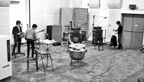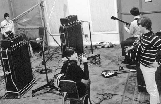 Beatles For Sale photo sessions show Abbey Road studio 2 with all the gear The Beatles used for the songs from this album. George plays the Gretsch 6119 Tenessean (Tennessee rose) and his Rickenbacker 360/12, Paul the inseparable Hofner violin bass, John the acoustic-electrified Gibson J160E and two Rickenbacker 325: the new "Miami" and a 12-string.