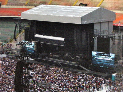E' un cubone alto 20 metri e largo 30, con i tubi drappeggiati di nero, posto nella solita posizione dei concerti di S.Siro, dove manca il terzo anello.