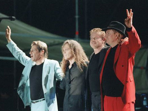 Puntuali come sempre, i giovani sessantenni si presentano sul palco in completo nero e camicia bianca.