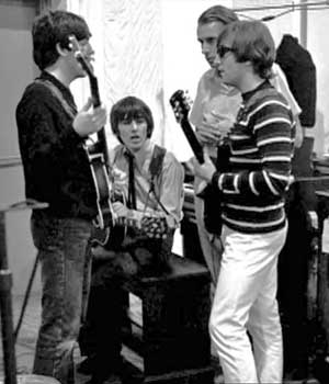 Beatles For Sale photo sessions show Abbey Road studio 2 with all the gear The Beatles used for the songs from this album. George plays the Gretsch 6119 Tenessean (Tennessee rose) and his Rickenbacker 360/12, Paul the inseparable Hofner violin bass, John the acoustic-electrified Gibson J160E and two Rickenbacker 325: the new "Miami" and a 12-string.
